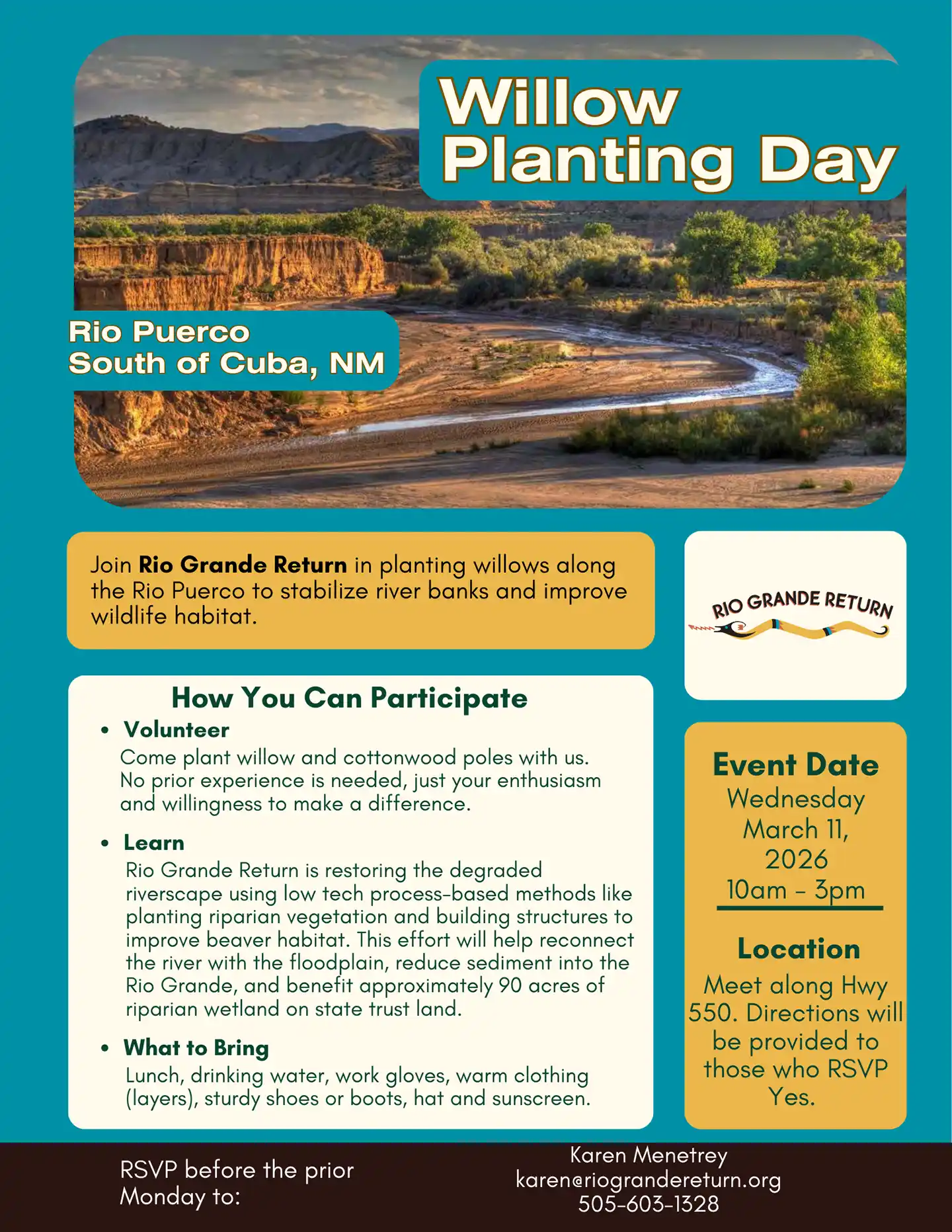 Join Rio Grande Return in planting willows along the Rio Puerco south of Cuba, NM to stabilize river banks and improve wildlife habitat.